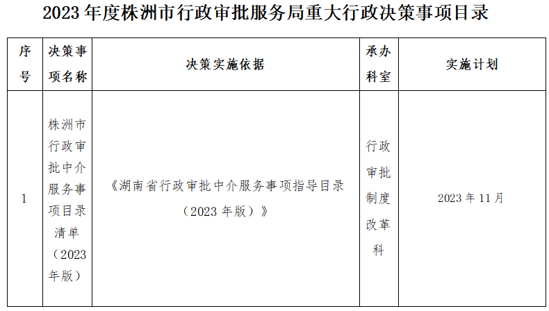 2023年度株洲市行政审批服务局重大行政决策事项目录