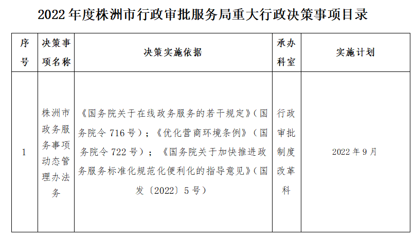 2022年度株洲市行政审批服务局重大行政决策事项目录